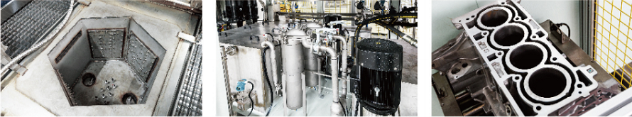 機器人抓取工件至浪涌池,對工件表面進(jìn)行低壓噴淋清洗及浪涌清洗,能快速剝離工件內殘留較大金屬顆粒,清洗完成后打開(kāi)電磁閥快速排出液體及循環(huán)過(guò)濾。